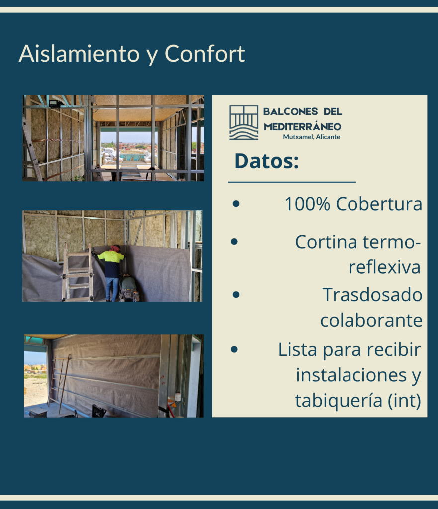 El Aislamiento térmico y Acústico para una construcción con clasificación energética A, lo conseguimos con Lana mineral en paneles de gran formato (90 mm a 200mm) instalado en la cámara interior de los marcos de acero de la estructura, revestida por una capa o cortina de vapor termo-reflexiva que evita la condensación por diferencia de temperatura entre el interior y el exterior de la construcción, sostenidas con un trasdosado interior (maestras/omega) de acero estructural, que soportará las placas de yeso y/o fibrocemento tipo Pladur © o Nauff © (NO INCLUIDAS)